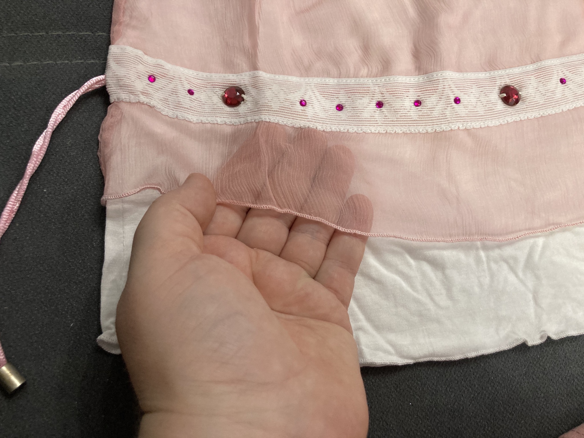 Снаружи у платья полупрозрачный нежный розовый шифон, и с обратной стороны такая же белая подкладка из трикотажа, как и верх платья. У платья снизу есть шнурки, чтобы утягивать низ юбки, но мне больше нравится образ с расслабленными шнурками. Длина достаточная, чтобы носить как под колготки, так и без них.